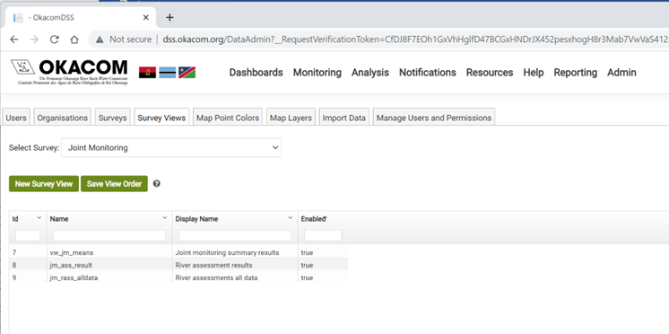 The Survey View is a view of data that is shown in the Monitoring or Analysis sections of the DSS. On entering the Survey Views tab, the user should select the survey in the Select Survey dropdown. This will return a list of survey views belonging to that survey.